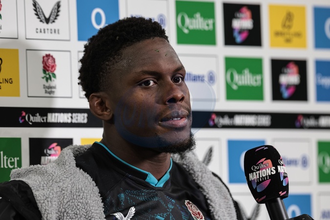 Mario Itoje of England in a post match interview during the Quilter Nations Series 2025 match England vs Argentina at Allianz Stadium, Twickenham, United Kingdom, 23rd November 2025, Credit:Mark Cosgrove/News Images / Avalon