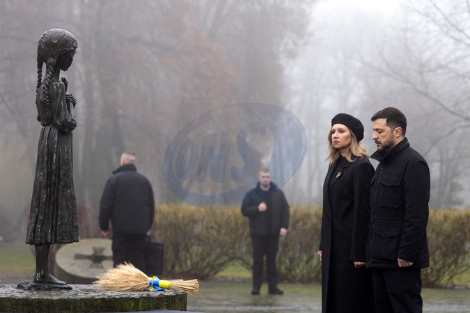 President of Ukraine Volodymyr Zelenskyy and First Lady Olena Zelenska honour the memory of the victims of the Holodomor of 1932–1933, along with the victims of mass man-made famines of 1921–1922 and 1946–1947. Laying sheaves at the Bitter Memory of Childhood monument, National Museum of the Holodomor-Genocide, Kyiv, Ukraine, 22 November 2025., Credit:Office of the President of Ukraine / Avalon