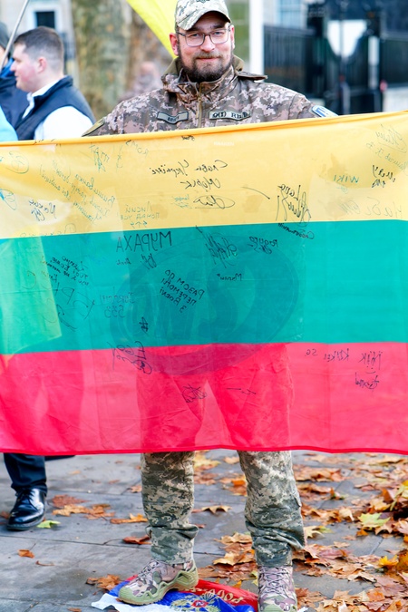 Sunday, 23 November 2025, Downing Street, London. Emergency Rally- Stand With Ukraine.The speakers put the case forward that there should be no peace deal without guaranties for territorial integrity, the right of Ukraine to defend itself and justice for all war crimes and payment for damages to Ukraine., Credit:Aldo Ciarrocchi / Avalon