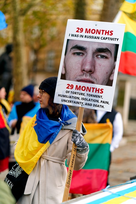 Sunday, 23 November 2025, Downing Street, London. Emergency Rally- Stand With Ukraine.The speakers put the case forward that there should be no peace deal without guaranties for territorial integrity, the right of Ukraine to defend itself and justice for all war crimes and payment for damages to Ukraine., Credit:Aldo Ciarrocchi / Avalon