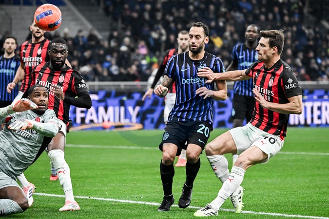San Siro Stadium, Matchday 12 of the Serie A ENILIVE Championship. Inter vs. Milan. Penalty for Inter, shot by Hakan Calhanoglu and saved by Mike Maignan. Milan, Italy 23 November 2025, Credit:Nicola Marfisi / Avalon