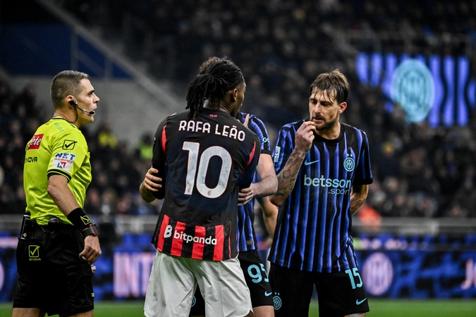 San Siro Stadium, Matchday 12 of the Serie A ENILIVE Championship. Inter vs. Milan. Discussion between Rafael Leao and Francesco Acerbi with the intervention of referee Sozza (Seregno section). Milan, Italy 23 November 2025, Credit:Nicola Marfisi / Avalon