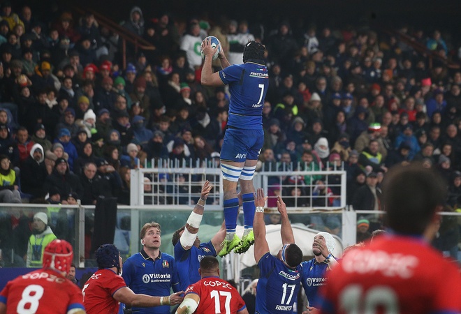 22/11/2025, Genoa Quilter Nations Series of Rugby Italy vs Chile, in the photo Michele Lamaro in the elevator, Credit:Massimo Lovati/AGF / Avalon