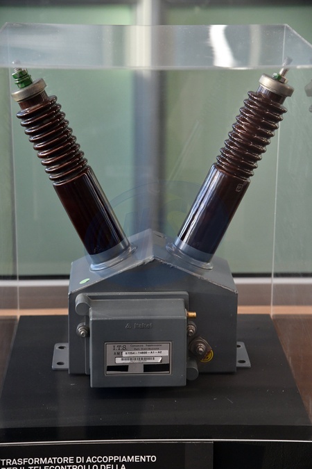 24/11/2025 Roma. La mostra "Acea Heritage", la storia di Acea e di luce e acqua nella capitale. Le opere degli artisti e degli architetti della sede centrale di Acea a Piramide, immagini d'archivio e oggetti di ingegneria industriale. TYrasformatore di accoppiamento per il controllo della rete MT, Credit:Mimmo Frassineti / Avalon