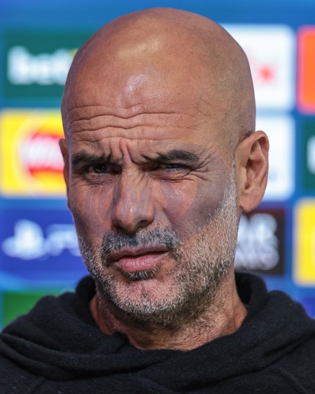 Pep Guardiola manager of Manchester City speaks to the press during the UEFA Champions League press conference Matchday 5 of 8 Manchester City vs Bayer 04 Leverkusen at Etihad Campus, Manchester, United Kingdom, 24th November 2025, Credit:Mark Cosgrove/News Images / Avalon