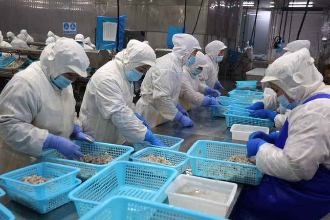 Workers labor at a seafood processor in Binzhou, in eastern China's Shandong province, Monday, Nov. 24, 2025. Binzhou produces 160,000 tons of salt-flat prawns annually from 20,000 hectares of coastal tidal ponds, relying on natural aquatic feed and benefiting from the water's high mineral content—which gives the prawns a distinctive flavor and texture., Credit:CHU BAORUI / Avalon