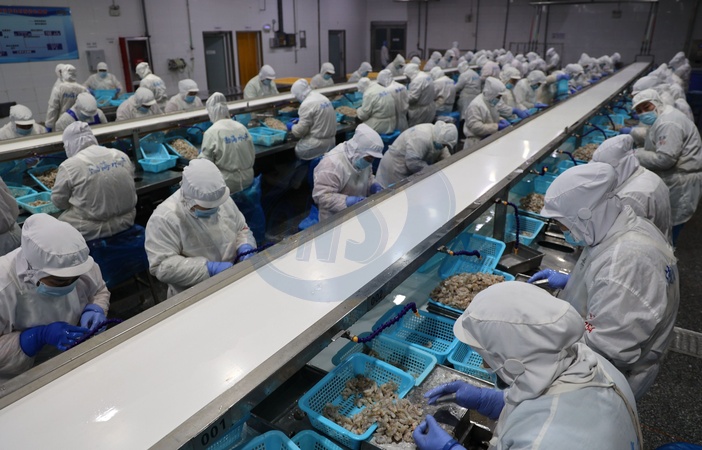 Workers labor at a seafood processor in Binzhou, in eastern China's Shandong province, Monday, Nov. 24, 2025. Binzhou produces 160,000 tons of salt-flat prawns annually from 20,000 hectares of coastal tidal ponds, relying on natural aquatic feed and benefiting from the water's high mineral content—which gives the prawns a distinctive flavor and texture., Credit:CHU BAORUI / Avalon