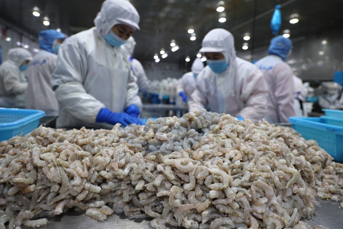Workers labor at a seafood processor in Binzhou, in eastern China's Shandong province, Monday, Nov. 24, 2025. Binzhou produces 160,000 tons of salt-flat prawns annually from 20,000 hectares of coastal tidal ponds, relying on natural aquatic feed and benefiting from the water's high mineral content—which gives the prawns a distinctive flavor and texture., Credit:CHU BAORUI / Avalon
