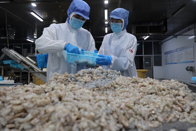 Workers labor at a seafood processor in Binzhou, in eastern China's Shandong province, Monday, Nov. 24, 2025. Binzhou produces 160,000 tons of salt-flat prawns annually from 20,000 hectares of coastal tidal ponds, relying on natural aquatic feed and benefiting from the water's high mineral content—which gives the prawns a distinctive flavor and texture., Credit:CHU BAORUI / Avalon