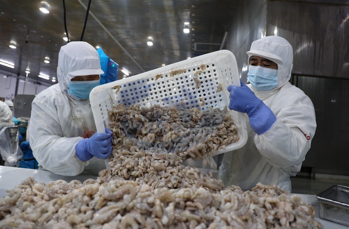 Workers labor at a seafood processor in Binzhou, in eastern China's Shandong province, Monday, Nov. 24, 2025. Binzhou produces 160,000 tons of salt-flat prawns annually from 20,000 hectares of coastal tidal ponds, relying on natural aquatic feed and benefiting from the water's high mineral content—which gives the prawns a distinctive flavor and texture., Credit:CHU BAORUI / Avalon