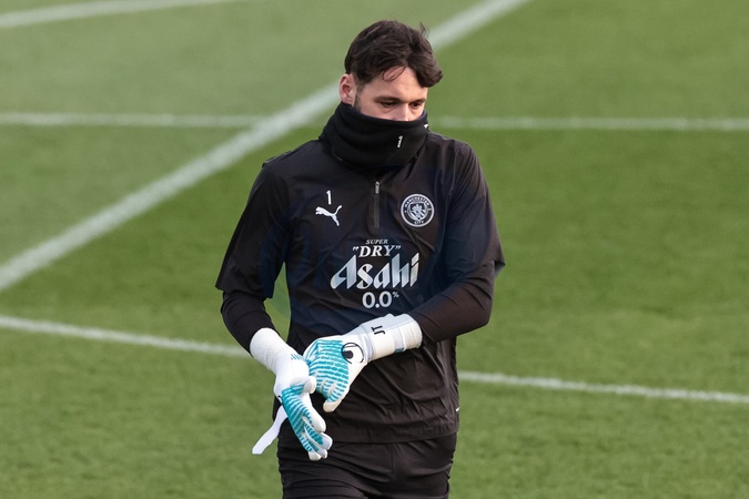 Manchester City goalkeeper James Trafford during the UEFA Champions League training session Matchday 5 of 8 Manchester City vs Bayer 04 Leverkusen at Etihad Campus, Manchester, United Kingdom, 24th November 2025, Credit:Mark Cosgrove/News Images / Avalon