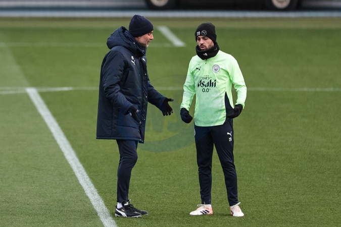 Pep Guardiola manager of Manchester City gives instruction to Bernardo Silva of Manchester City during the UEFA Champions League training session Matchday 5 of 8 Manchester City vs Bayer 04 Leverkusen at Etihad Campus, Manchester, United Kingdom, 24th November 2025, Credit:Mark Cosgrove/News Images / Avalon