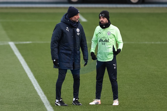 Pep Guardiola manager of Manchester City gives instruction to Bernardo Silva of Manchester City during the UEFA Champions League training session Matchday 5 of 8 Manchester City vs Bayer 04 Leverkusen at Etihad Campus, Manchester, United Kingdom, 24th November 2025, Credit:Mark Cosgrove/News Images / Avalon