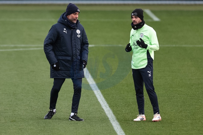 Pep Guardiola manager of Manchester City gives instruction to Bernardo Silva of Manchester City during the UEFA Champions League training session Matchday 5 of 8 Manchester City vs Bayer 04 Leverkusen at Etihad Campus, Manchester, United Kingdom, 24th November 2025, Credit:Mark Cosgrove/News Images / Avalon