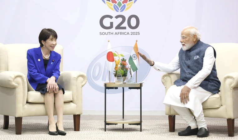 Japanese Prime Minister Sanae Takaichi (L) holds talks with Indian Prime Minister Narendra Modi on the sidelines of a Group of 20 summit in Johannesburg on Nov. 23, 2025., Credit:Kyodo/Newscom / Avalon