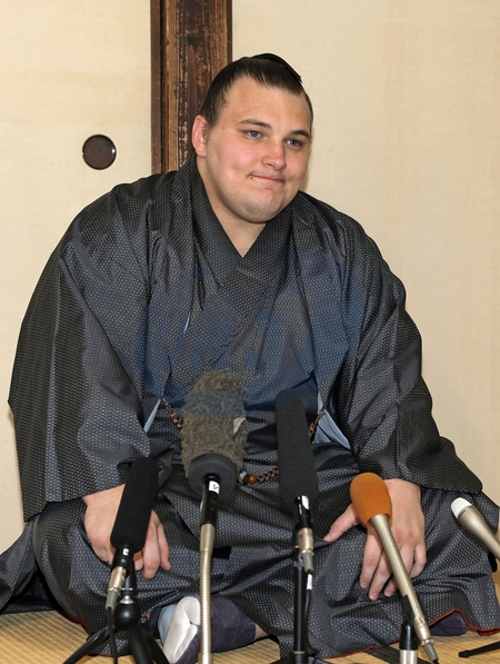 Ukrainian sumo wrestler Aonishiki holds a press conference at his stable's lodgings in Kurume in Fukuoka Prefecture, southwestern Japan, on Nov. 24, 2025, a day after winning the Kyushu Grand Sumo Tournament in the prefecture., Credit:Kyodo/Newscom / Avalon