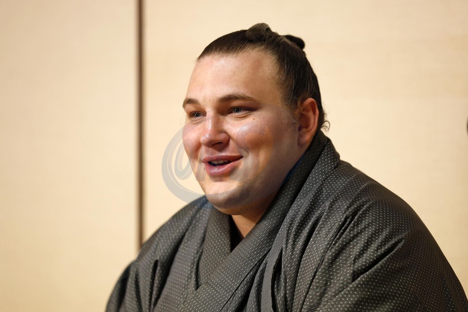 Ukrainian sumo wrestler Aonishiki holds a press conference at his stable's lodgings in Kurume in Fukuoka Prefecture, southwestern Japan, on Nov. 24, 2025, a day after winning the Kyushu Grand Sumo Tournament in the prefecture., Credit:Kyodo/Newscom / Avalon
