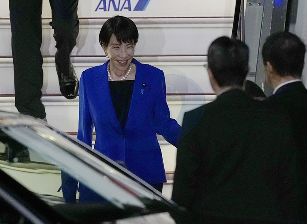 Japanese Prime Minister Sanae Takaichi (L) arrives at Tokyo's Haneda airport on Nov. 24, 2025, after attending a two-day Group of 20 summit in Johannesburg., Credit:Kyodo/Newscom / Avalon