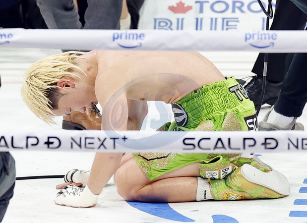 Tenshin Nasukawa of Japan kneels on the mat after his loss to compatriot Takuma Inoue in their WBC bantamweight world title bout at Toyota Arena Tokyo on Nov. 24, 2025., Credit:Kyodo/Newscom / Avalon