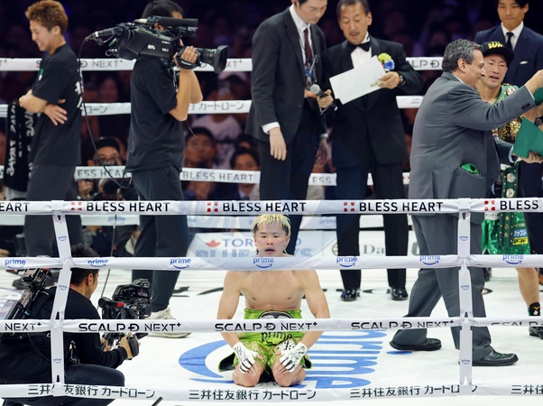 Tenshin Nasukawa of Japan kneels on the mat after his loss to compatriot Takuma Inoue in their WBC bantamweight world title bout at Toyota Arena Tokyo on Nov. 24, 2025., Credit:Kyodo/Newscom / Avalon