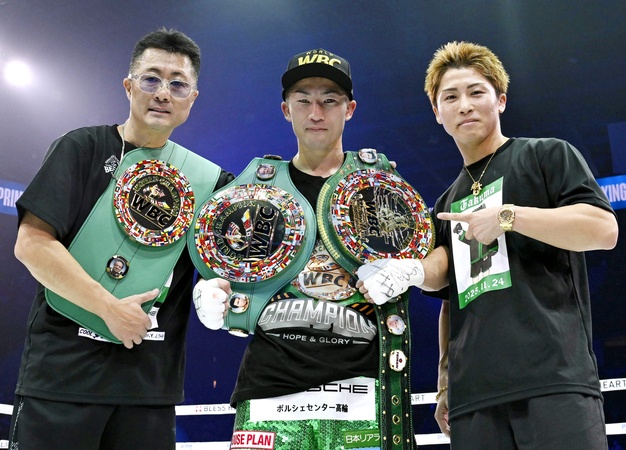 Takuma Inoue (C) of Japan poses after beating compatriot Tenshin Nasukawa in their WBC bantamweight world title bout at Toyota Arena Tokyo on Nov. 24, 2025. Alongside is his older brother and undisputed super bantamweight world champion, Naoya Inoue (R)., Credit:Kyodo/Newscom / Avalon