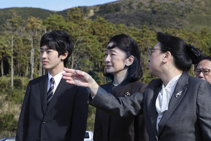 Japanese Crown Princess Kiko (C) and her son Prince Hisahito hear about the situation at the time of a 2013 deadly mudslide disaster on Izu Oshima Island, south of Tokyo, during their visit to a memorial for its victims on Nov. 22, 2025., Credit:Kyodo/Newscom / Avalon