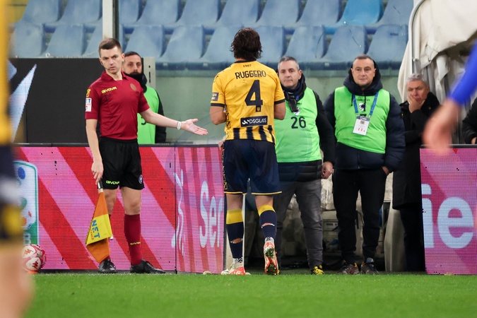 November 24, 2025, Genoa. Serie B football championship, Sampdoria vs. Juve Stabia. Pictured: Ruggero's red card., Credit:Gabriele Siri/AGF / Avalon
