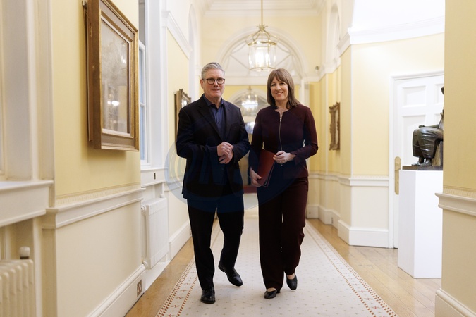24/11/2025. London, United Kingdom. Prime Minister Keir Starmer and Chancellor of the Exchequer Rachel Reeves chat outside the cabinet room before a budget meeting in 10 Downing Street., Credit:Simon Dawson / Avalon