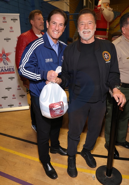 25 November 2025 . Los Angeles, California - Nathan Hochman, Governor Arnold Schwarzenegger At 44th Annual Miracle on 1st Street Turkey Giveaway! held at The Hollenbeck Youth Center in Los Angeles., Credit:Sadou Faye / Avalon