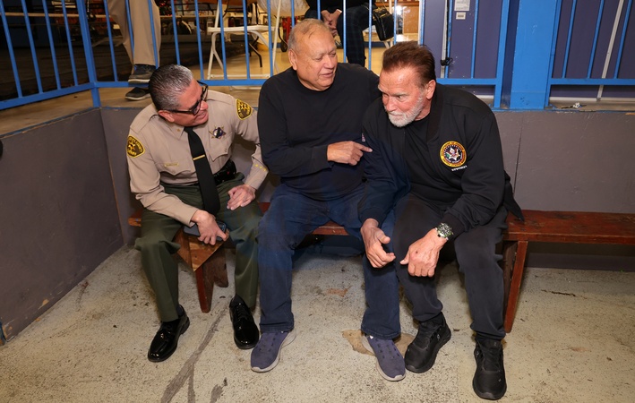 25 November 2025 . Los Angeles, California - Oscar O Barragan, Danny Hernandez, Governor Arnold Schwarzenegger At 44th Annual Miracle on 1st Street Turkey Giveaway! held at The Hollenbeck Youth Center in Los Angeles., Credit:Sadou Faye / Avalon