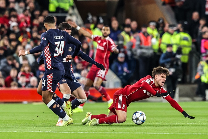 Milos Kerkez of Liverpool is fouled by Ismael Saibari of PSV Eindhoven during the UEFA Champions League Matchday 5 of 8 Liverpool vs PSV Eindhoven at Anfield, Liverpool, United Kingdom, 26th November 2025, Credit:Ae Cosgrove/News Images / Avalon