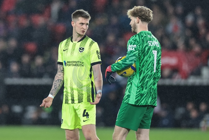 Josh Knight of Portsmouth speaks to Portsmouth goalkeeper Nicolas Schmid during the Sky Bet Championship match Sheffield United vs Portsmouth at Bramall Lane, Sheffield, United Kingdom, 26th November 2025, Credit:Mark Cosgrove/News Images / Avalon