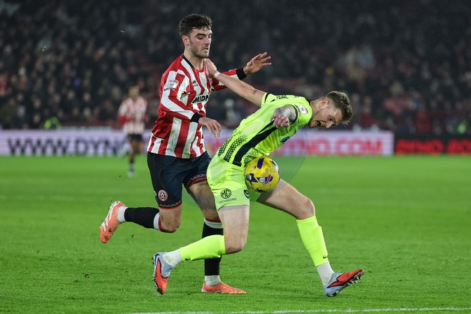 Josh Knight of Portsmouth is fouled by Tom Cannon of Sheffield United during the Sky Bet Championship match Sheffield United vs Portsmouth at Bramall Lane, Sheffield, United Kingdom, 26th November 2025, Credit:Mark Cosgrove/News Images / Avalon
