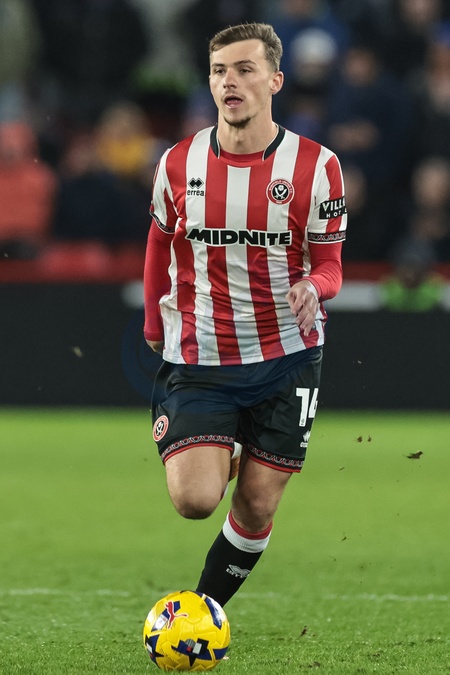 Harrison Burrows of Sheffield United breaks with the ball during the Sky Bet Championship match Sheffield United vs Portsmouth at Bramall Lane, Sheffield, United Kingdom, 26th November 2025, Credit:Mark Cosgrove/News Images / Avalon