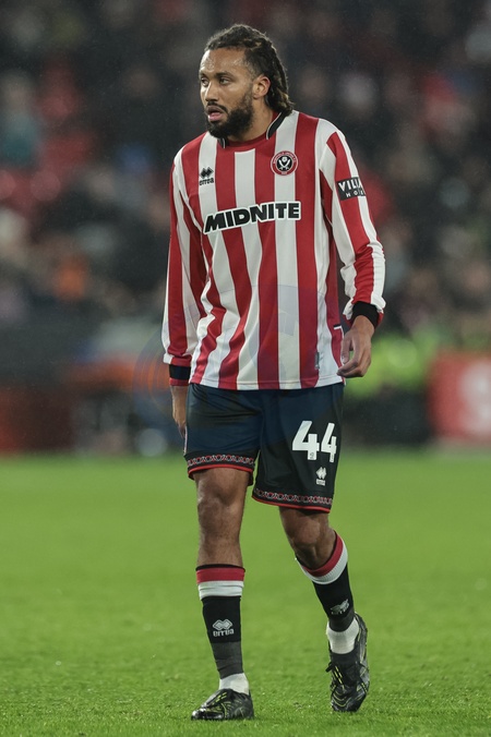 Jaïro Riedewald of Sheffield United during the Sky Bet Championship match Sheffield United vs Portsmouth at Bramall Lane, Sheffield, United Kingdom, 26th November 2025, Credit:Mark Cosgrove/News Images / Avalon