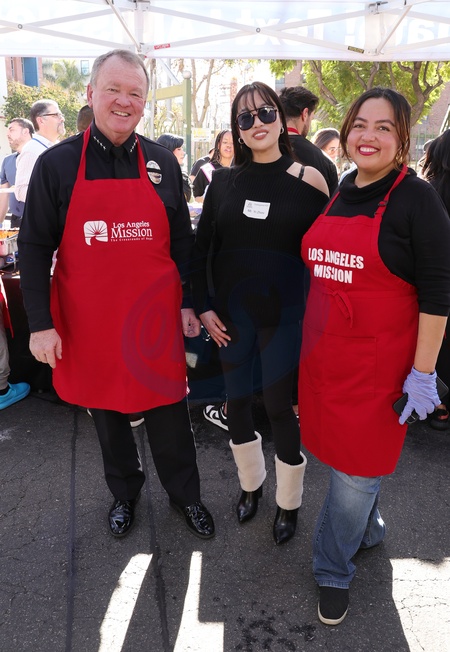 26 November 2025 . Los Angeles, California - Chief of the Los Angeles Police Department Jim McDonnell, Wendy Carrillo, Yi Zhou At 2025 Thanks & Giving On Skid Row held at Los Angeles Mission in Los Angeles., Credit:Sadou Faye / Avalon