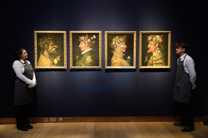 Art handlers 'The Four Seasons' from The Workshop of Giuseppe Arcimboldo (est. £800k £1.2m) as part of Christie's 'Old Masters Evening Sale' Auction which will take place on 2nd December 2025 - Christie's King Street, London, England, UK on Thursday 27 November, 2025., Credit:Justin Ng / Avalon