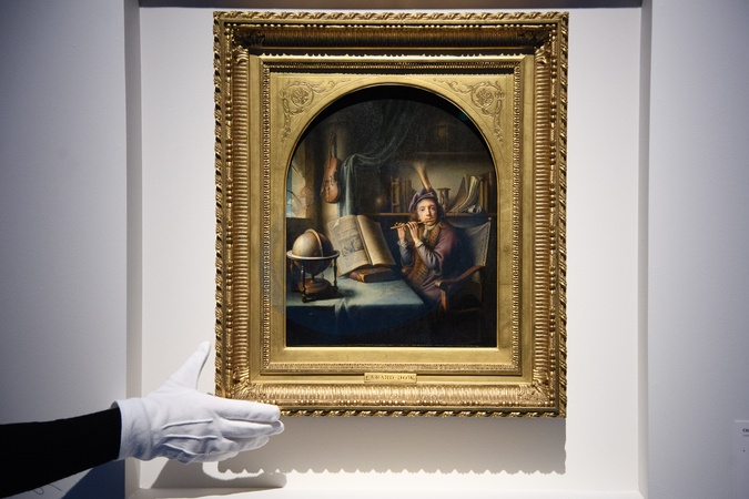 Art handlers 'The Flute Player' by Gerrit Dou (est. £2m - £3m) as part of Christie's 'Old Masters Evening Sale' Auction which will take place on 2nd December 2025 - Christie's King Street, London, England, UK on Thursday 27 November, 2025., Credit:Justin Ng / Avalon