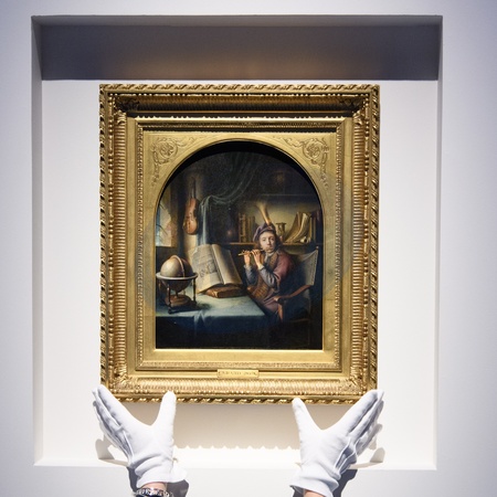 Art handlers 'The Flute Player' by Gerrit Dou (est. £2m - £3m) as part of Christie's 'Old Masters Evening Sale' Auction which will take place on 2nd December 2025 - Christie's King Street, London, England, UK on Thursday 27 November, 2025., Credit:Justin Ng / Avalon