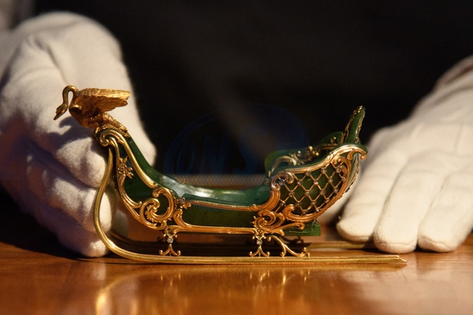 An art handler holds 'A rare jewelled Gold-Mounted Nephrite Miniature Model of a sleigh' by Faberge workmaster Michael Perchin (est. £350k - £450k) as part of Christie's 'The Winter Egg and Important Works by Faberge from a Princely Collection' Auction which will take place on 2nd December 2025 - Christie's King Street, London, England, UK on Thursday 27 November, 2025., Credit:Justin Ng / Avalon