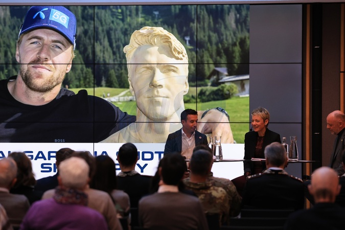 Audi FIS Ski World Cup, Presentation of the Alpine Skiing World Cup. The men's events in Val Gardena and Alta Badia are presented to the press ahead of the Mico26 Olympic season. Pictured is Aleksander Aamodt Kilde with his wooden statue. Bolzano, Nov 27th 2025, Credit:Pierre Teyssot/AGF / Avalon