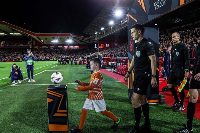 Referee Harm Osmers leads the teams out for the game during the UEFA Europa League Matchday 5 of 8 Nottingham Forest vs Malmo FF at City Ground, Nottingham, United Kingdom, 27th November 2025, Credit:Mark Cosgrove/News Images / Avalon