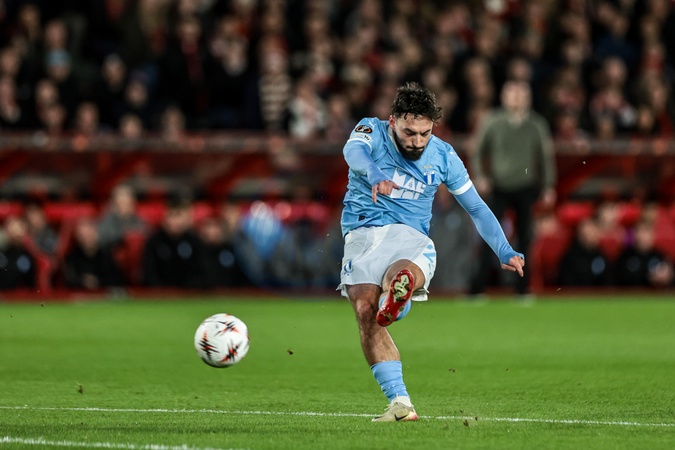 Sead Haksabanovic of Malmo FF takes a shot on goal during the UEFA Europa League Matchday 5 of 8 Nottingham Forest vs Malmo FF at City Ground, Nottingham, United Kingdom, 27th November 2025, Credit:Mark Cosgrove/News Images / Avalon