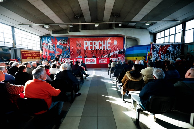 Maurizio Landini at the Marghera Petrochemical Plant warehouse to explain the reasons for the December 12 general strike. Margera, Italy 27 November 2025, Credit:Mirco Toniolo - Rbmultimedia / Avalon