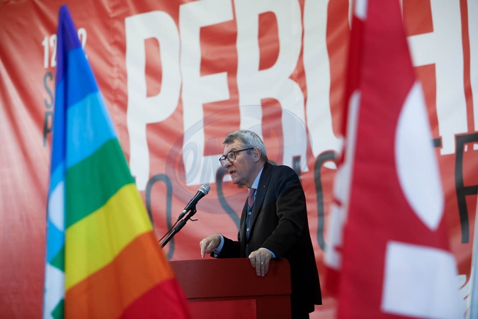Maurizio Landini at the Marghera Petrochemical Plant warehouse to explain the reasons for the December 12 general strike. Margera, Italy 27 November 2025, Credit:Mirco Toniolo - Rbmultimedia / Avalon