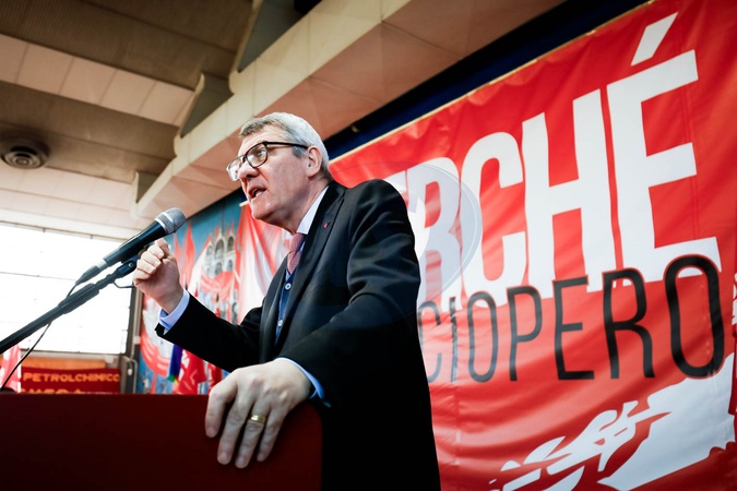 Maurizio Landini at the Marghera Petrochemical Plant warehouse to explain the reasons for the December 12 general strike. Margera, Italy 27 November 2025, Credit:Mirco Toniolo - Rbmultimedia / Avalon