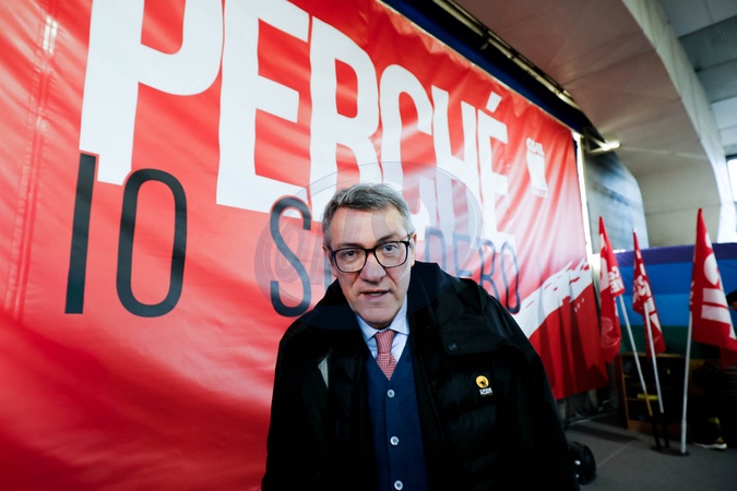 Maurizio Landini at the Marghera Petrochemical Plant warehouse to explain the reasons for the December 12 general strike. Margera, Italy 27 November 2025, Credit:Mirco Toniolo - Rbmultimedia / Avalon
