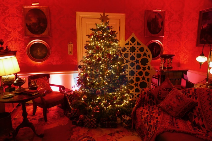 The beautifully decorated rooms with the themes of pantomimes at Hinton Ampner House in Hampshire. Visitors are invited to join them this Christmas and discover scenes from the most loved pantomimes. Twinkling fairylights shimmer their magic across the beautiful house. Every room of the ground floor features a different, pantomime. Come and bask in the glow of Aladdin's lamp, see Jack's magic beans and a glittering Cinderella slipper, discover Snow White's sumptuous forest feast and marvel at a quilted mountain of mattresses made ready for a sleepy princess. Fe, fi, fo, fum, is that a giant I hear at Hinton Ampner?, Credit:Geoffrey Swaine / Avalon