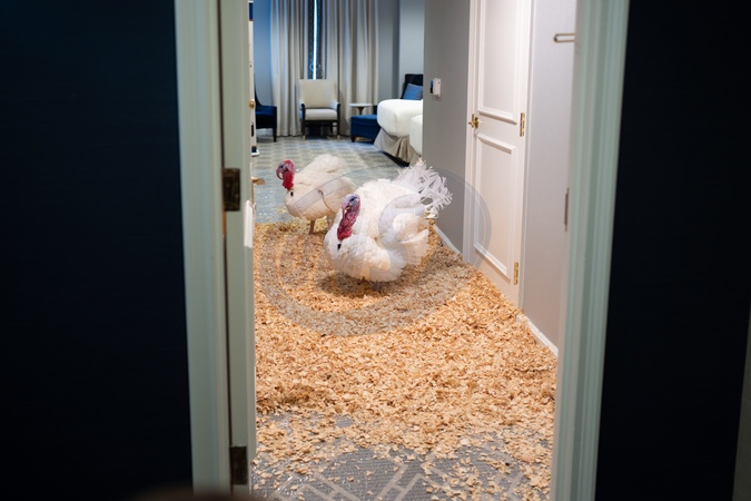 The 2025 Presidential Turkeys, named Gobble and Waddle, arrive at the Willard InterContinental Hotel in Washington, D.C., on Sunday, November 24, 2025., Credit:Andrea Hanks / Avalon