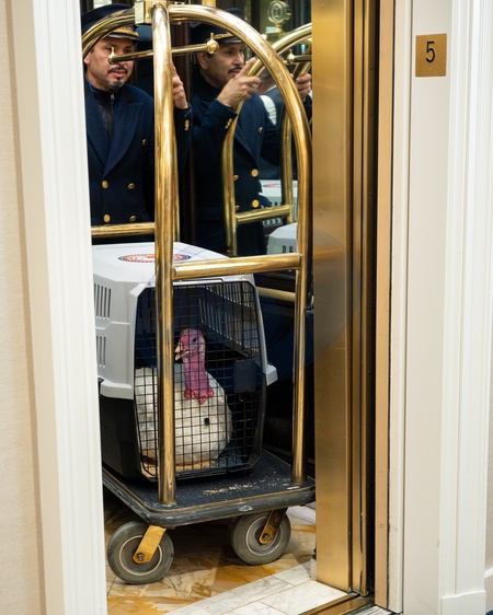The 2025 Presidential Turkeys, named Gobble and Waddle, arrive at the Willard InterContinental Hotel in Washington, D.C., on Sunday, November 24, 2025., Credit:Andrea Hanks / Avalon